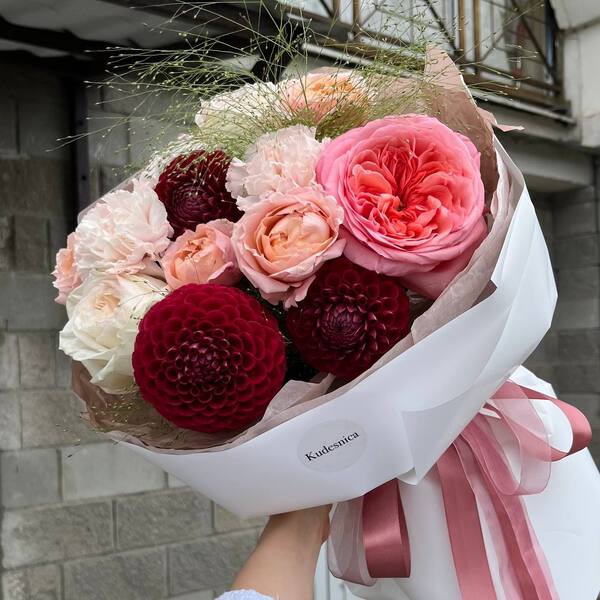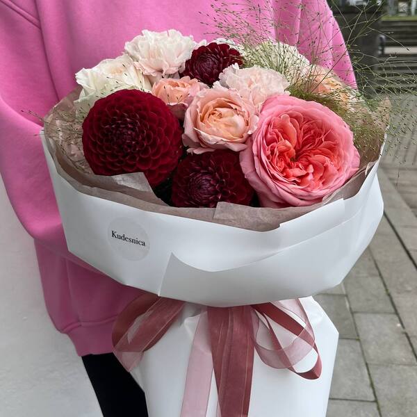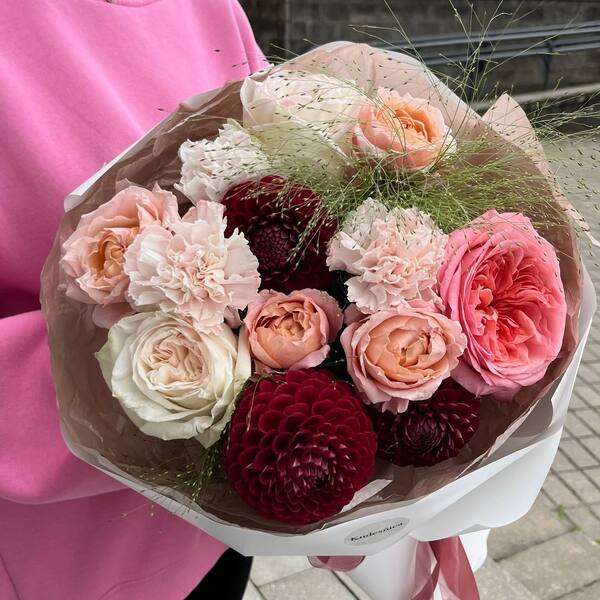 Состав: кустовая пионовидная роза, пионовидная роза, георгина, паникум, гвоздика, авторская упаковка.