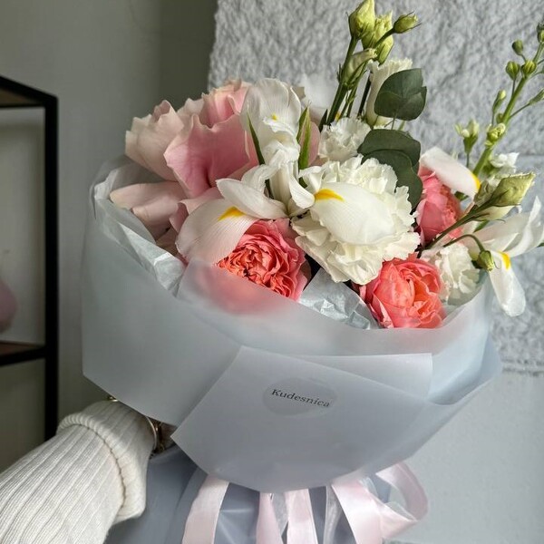 Состав: ирис, матиолла, роза кустовая пионовидная, французская роза, эустома, эвкалипт, авторская упаковка.