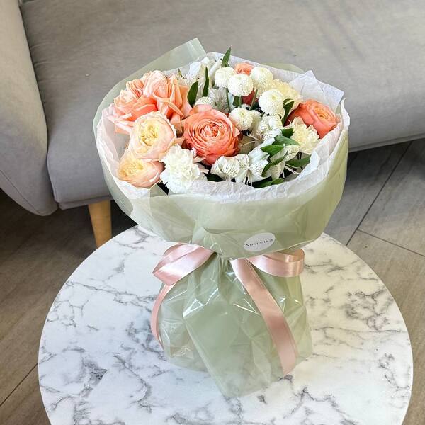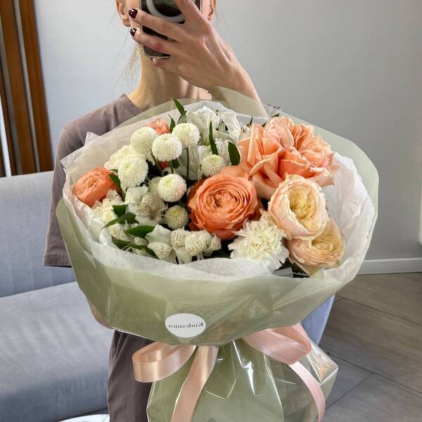 Состав: прза кустовая пионовидная, роза одноголовая, хризантема кустовая, альстромерия, гвоздика, авторская упаковка.