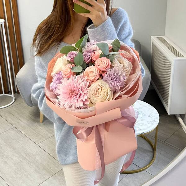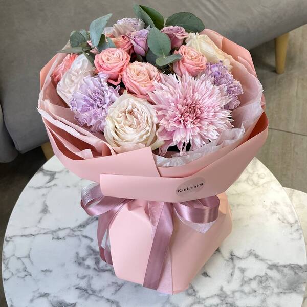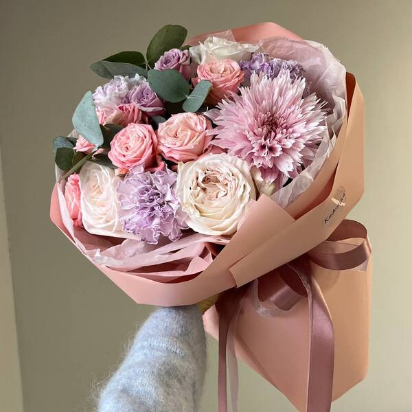 Состав: роза одноголовая, роза кустовая пионовидная, гвоздика, хризантема, эвкалипт, авторская упаковка.