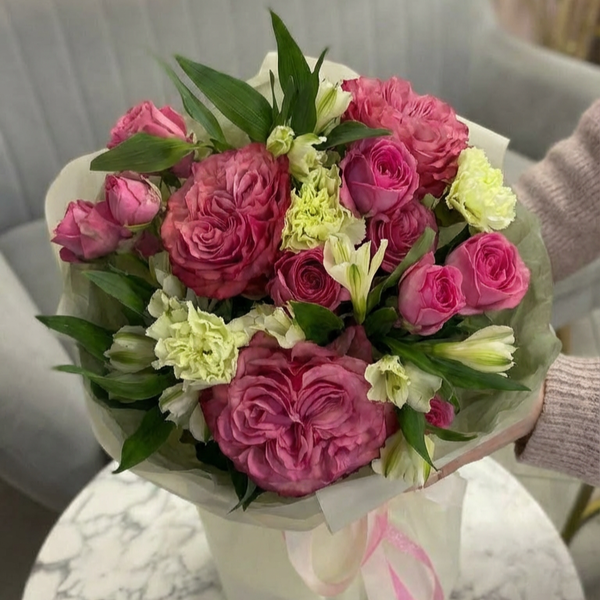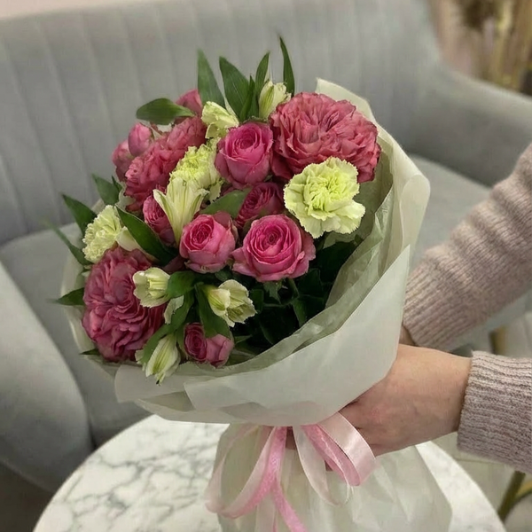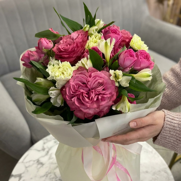Состав: роза одноголовая, роза кустовая пионовидная, альстромерия, авторская упаковка.