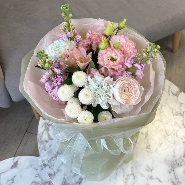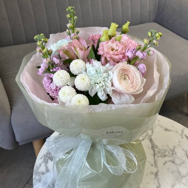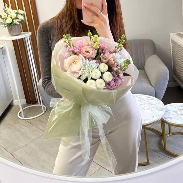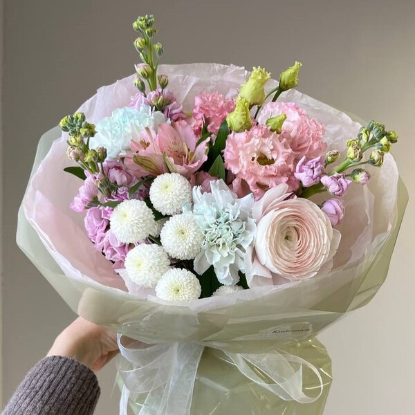 Состав: маттиола, хризантема кустовая, эустома, альстромерия, гвоздика крашеная, авторская упаковка.