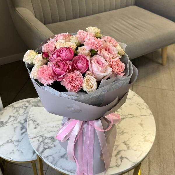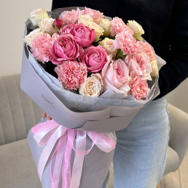 Состав: кустовая пионовидная роза, одноголовая пионовидная роза, гвоздика, авторская упаковка.