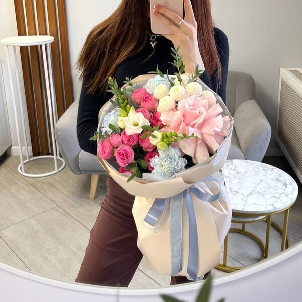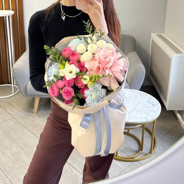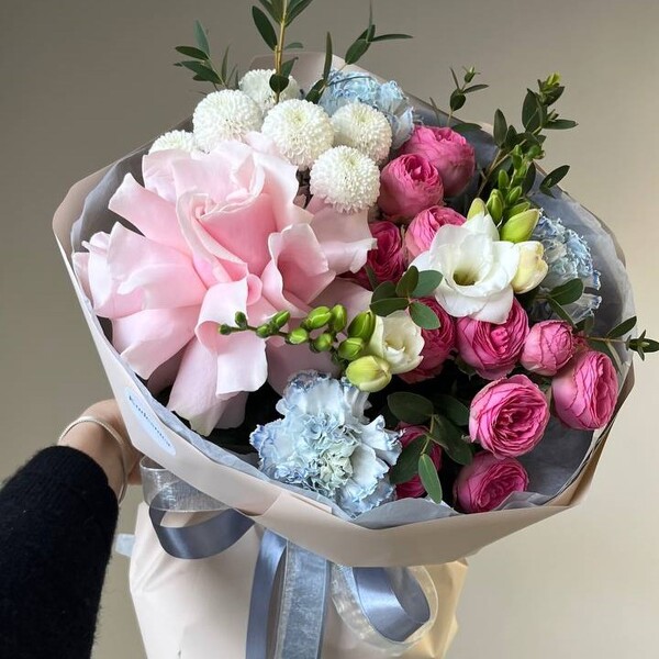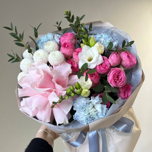 Состав: французская роза, роза кустовая пионовидная, гвоздика, фрезия, эвкалипт, авторская упаковка.