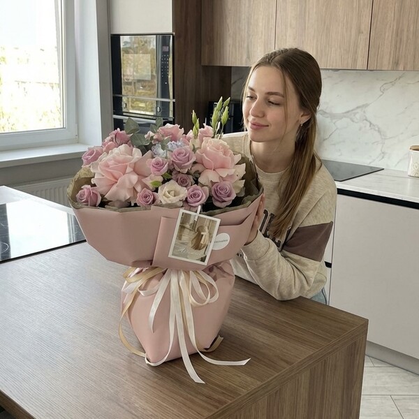 Состав: французская роза, кустовая пиоиновидная роза, эустома, гвоздика, эвкалипт, авторская упаковка. Открытка в подарок.
