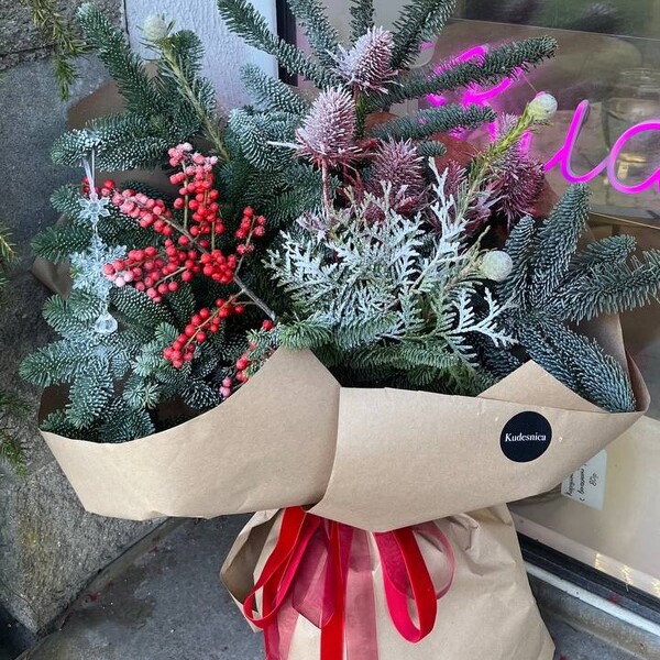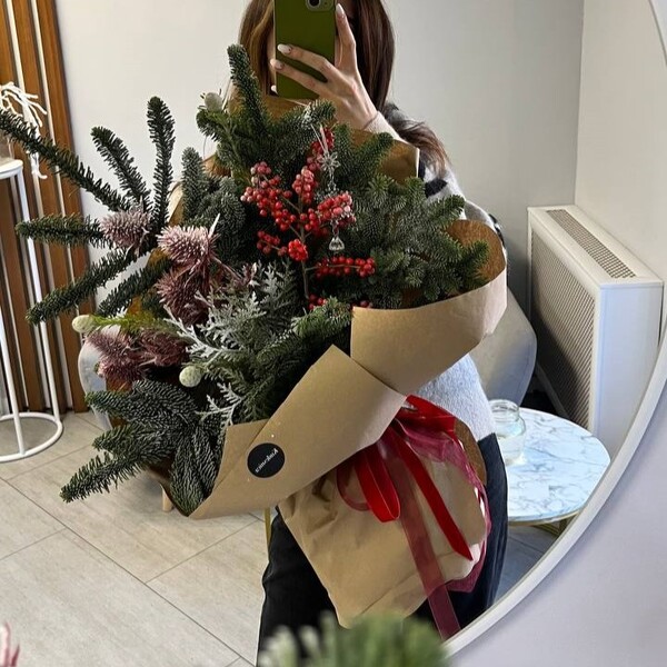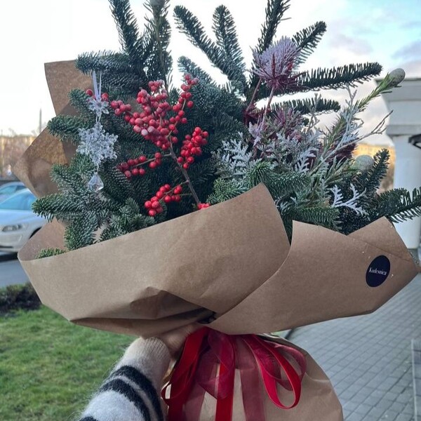 Состав: нобилис, эрингиум, иллекс, бруния, игрушка декоративная, авторская упаковка.