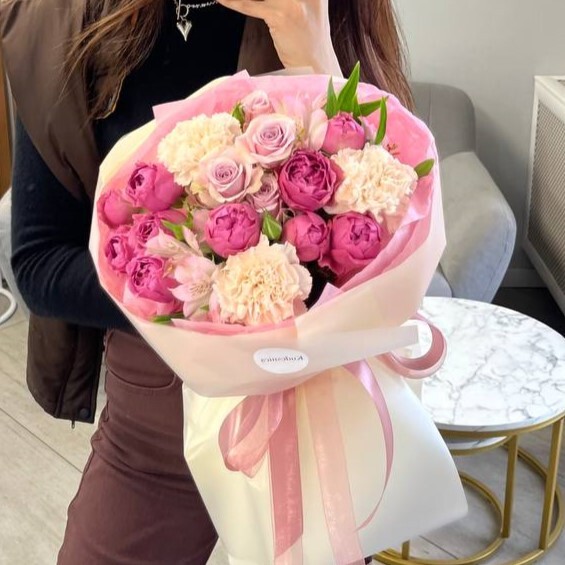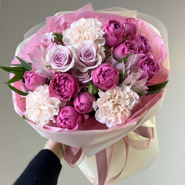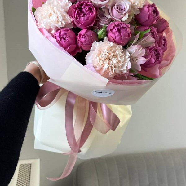 Состав: роза кустовая пионовидная, гвоздика, альстромерия, эвкалипт, авторская упаковка.