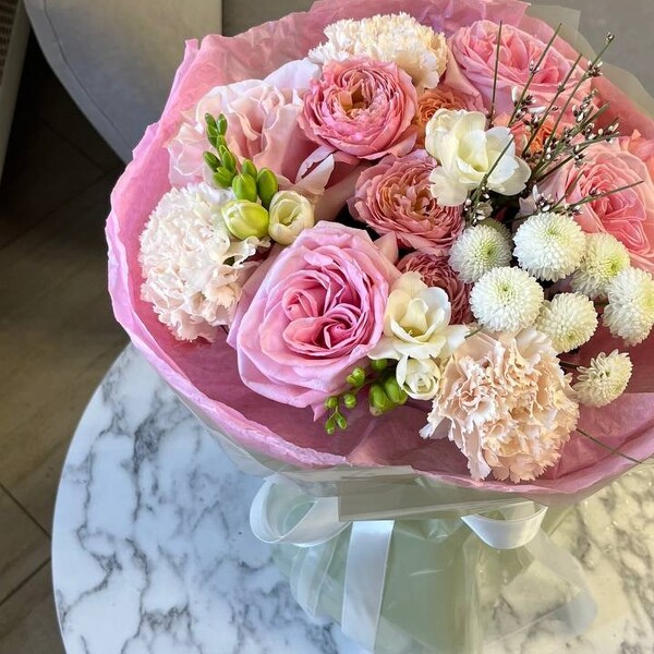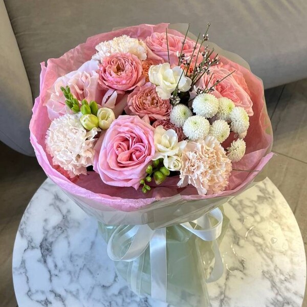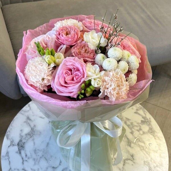 Состав: роза одноголовая, роза кустовая пионовидная, гениста, фрезия, гвоздика, хризантема кустовая, авторская упаковка.