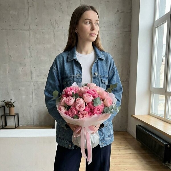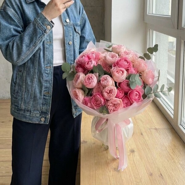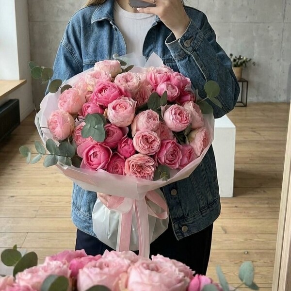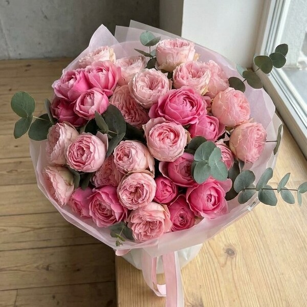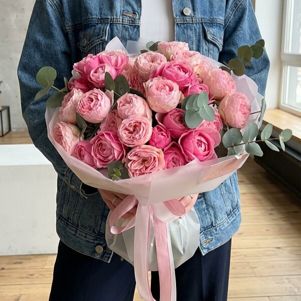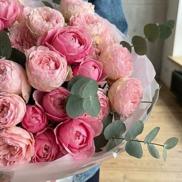 Состав: кустовая пионовидная роза разных сортов, эвкалипт, авторская упаковка. Сумка-переноска и аквабокс доступна к заказу за дополнительную плату.