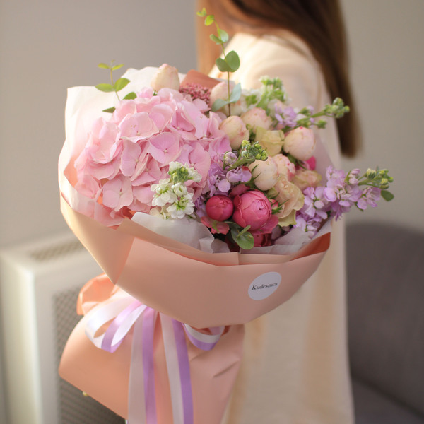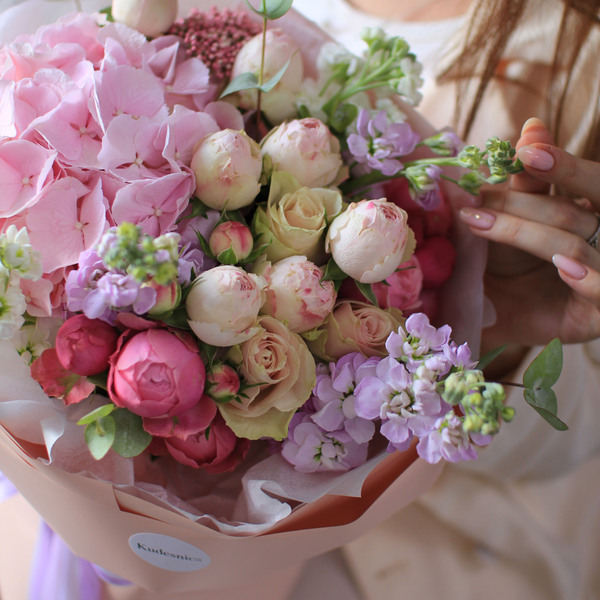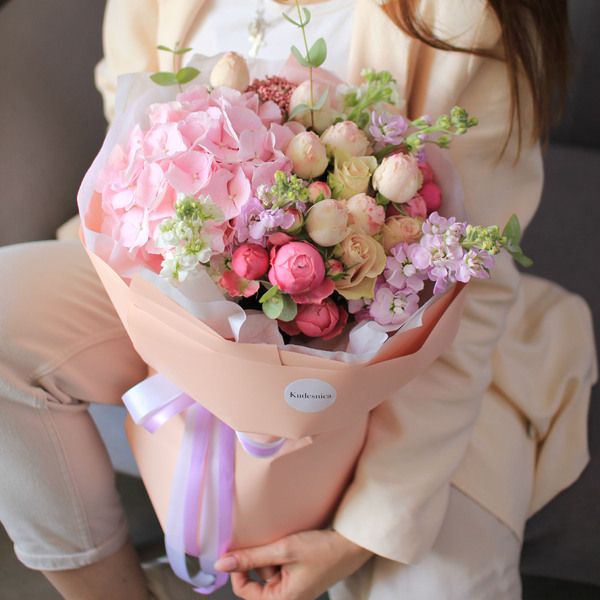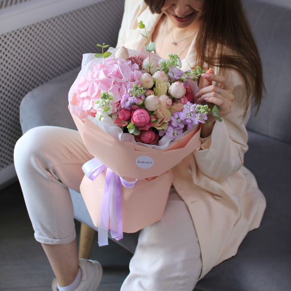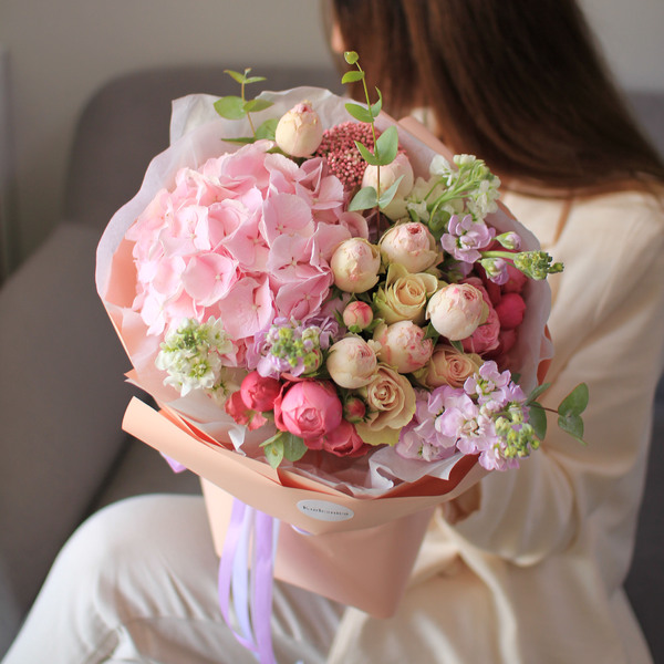 Состав: гортензия, пионовидные розы, веточки эвкалипта, авторская упаковка.