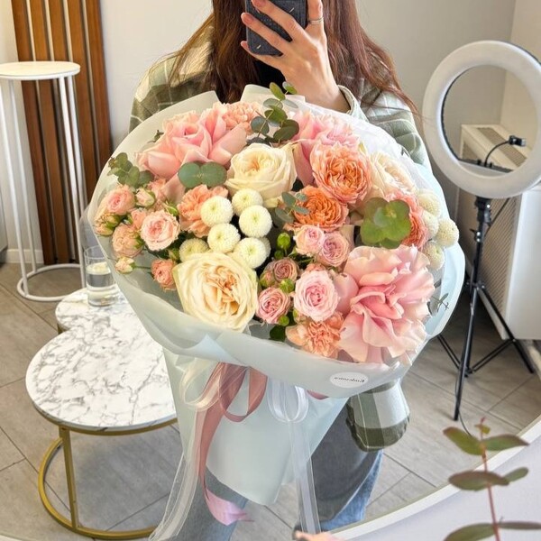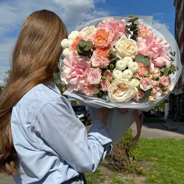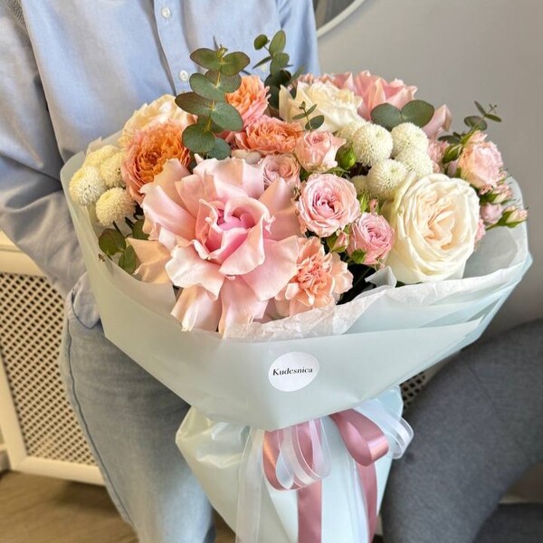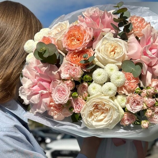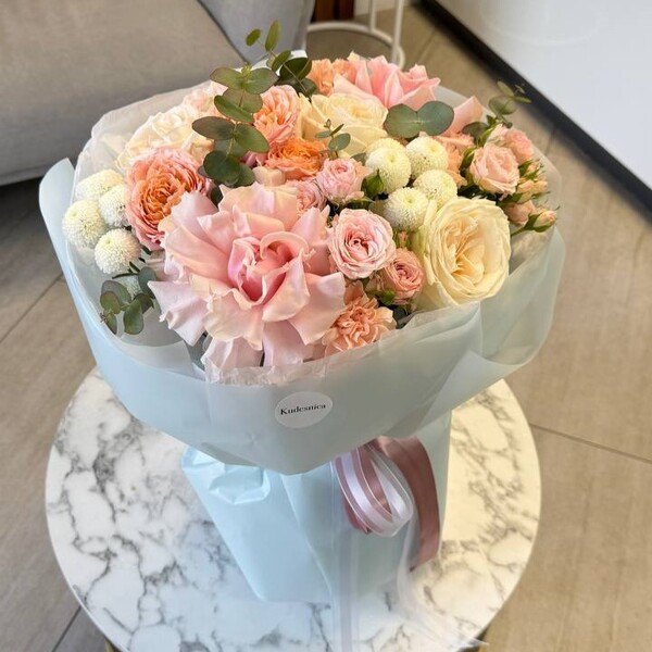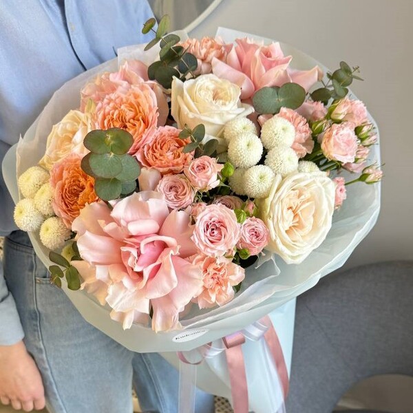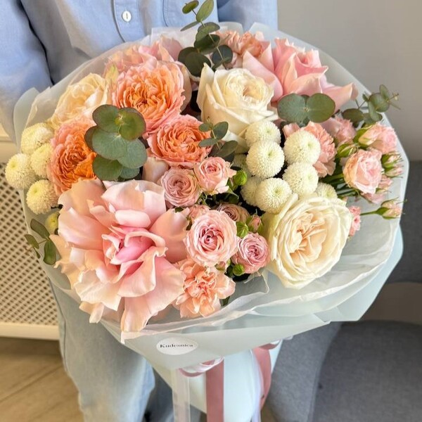 Состав: роза французская, роза кустовая пионовидная, роза кустовая, роза одноголовая, хризантема кустовая, эвкадипт, авторская упаковка.