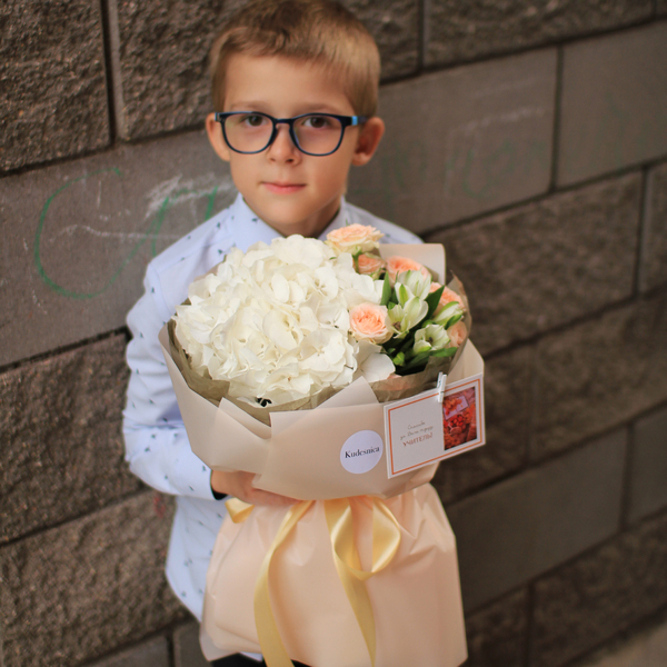 Состав: гортензия, пионовидная кустовая роза, альстромерия, авторская упаковка.