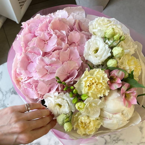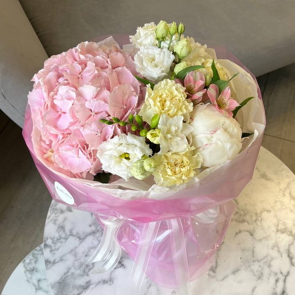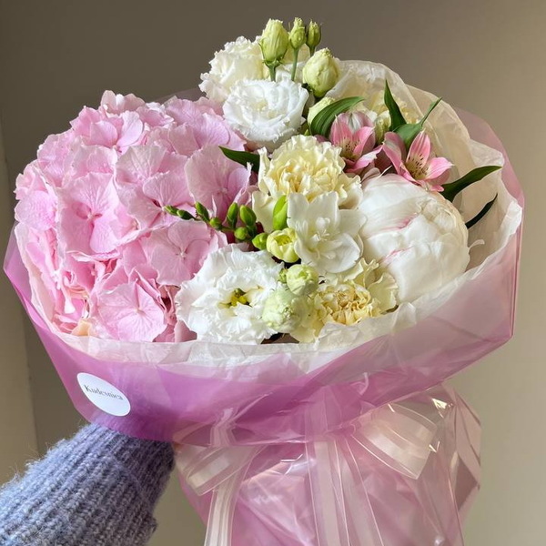 Состав: гортензия, эустома, фрезия, гвоздика, альстромерия, авторская упаковка.