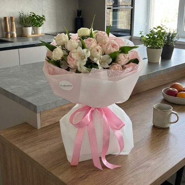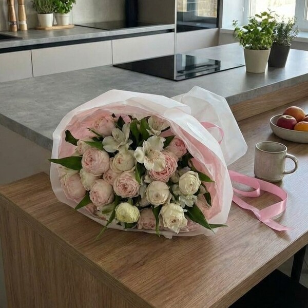 Состав: роза кустовая пионовидная, альстромерия, авторская упаковка.