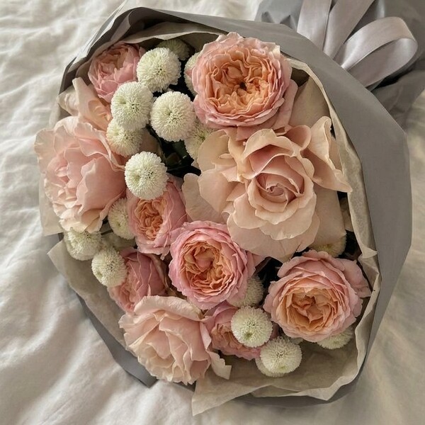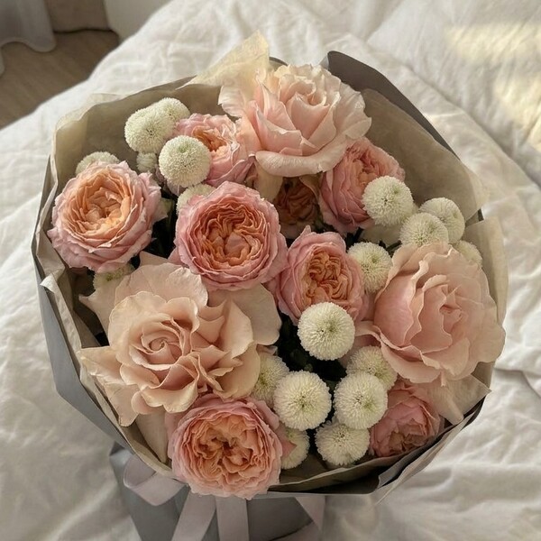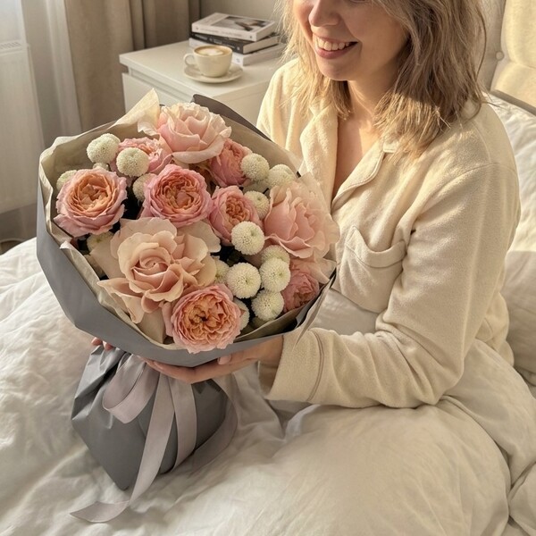 Состав: французская роза, кустовая пионовидная роза, хризантема, авторская упаковка.