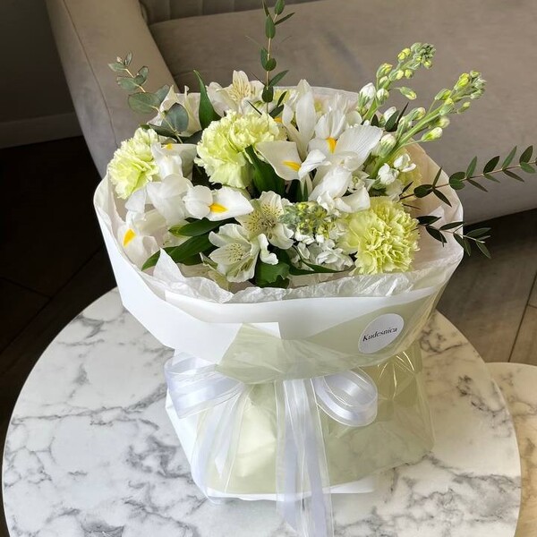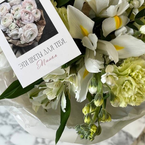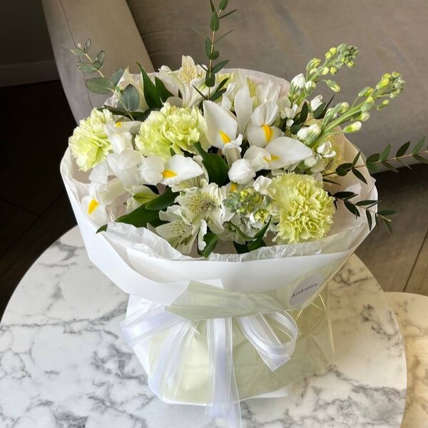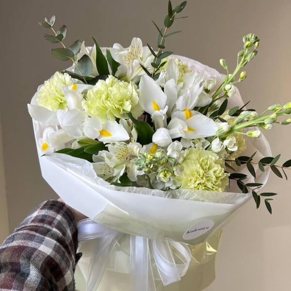 Состав: ирис, маттиола, гвоздика, альстромерия, эвкалипт, авторская упаковка.