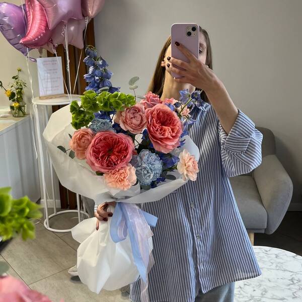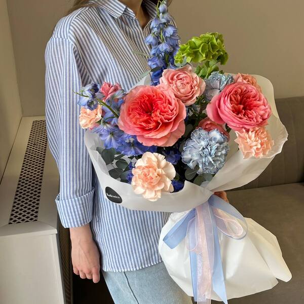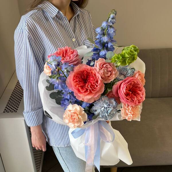 Состав: дельфиниум, роза одноголовая пионовидная, молюцелла, гвоздика, эвкалипт, роза кустовая пионовидная, авторская упаковка.