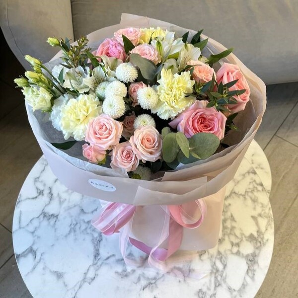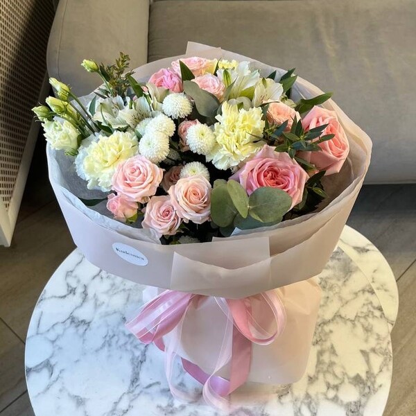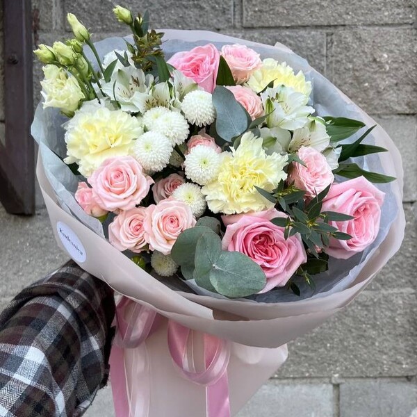 Состав: роза одноголовая, роза кустовая пионовидная, хризантема кустовая, альстромерия, гвоздика, эвкалипт, авторская упаковка.