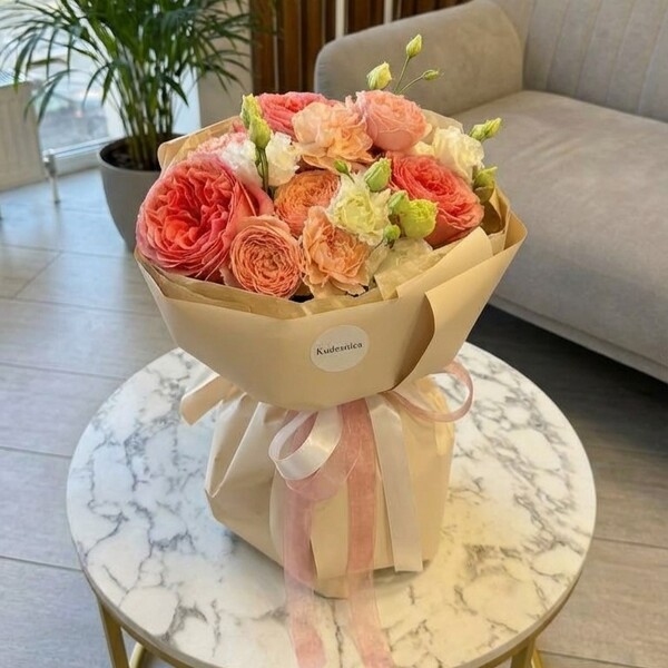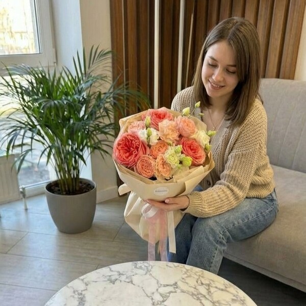 Состав: роза одноголовая, роза кустовая пионовидная, эустома, гвоздика, авторская упаковка.