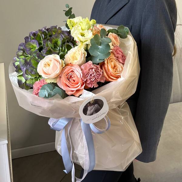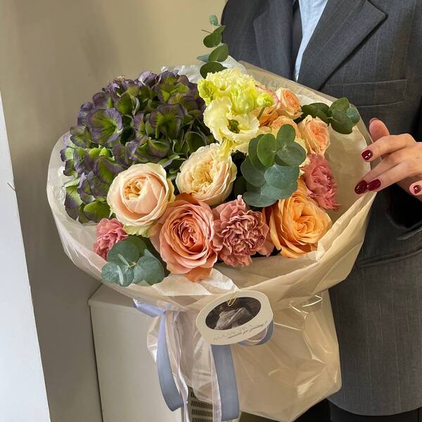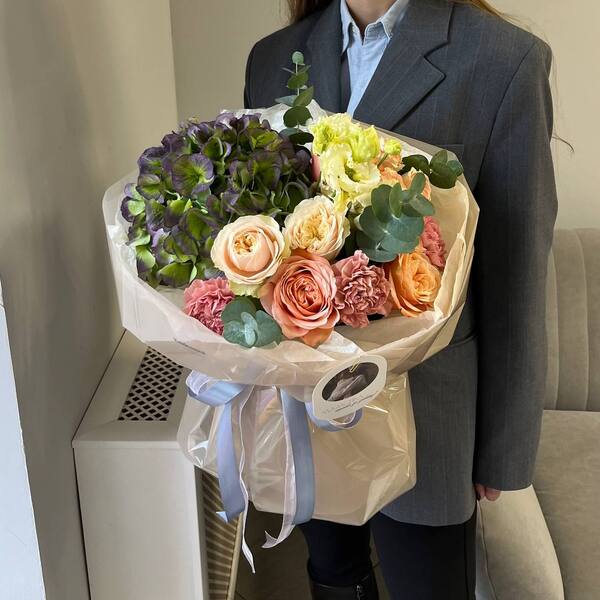Состав: гортензия, роза кустовая пионовидная, гвоздика, эустома, эвкалипт, авторская упаковка.