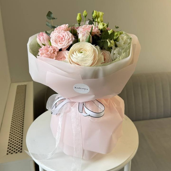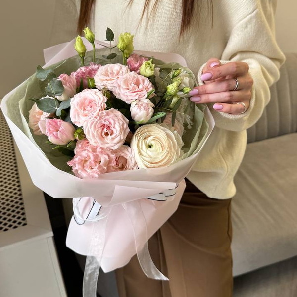 Состав: роза кустовая пионовидная, ранункулюс, эустома, тюльпан, эвкалипт, авторская упаковка.