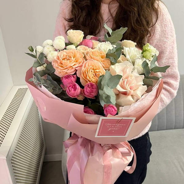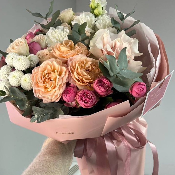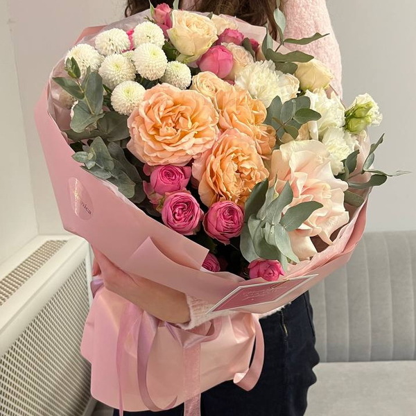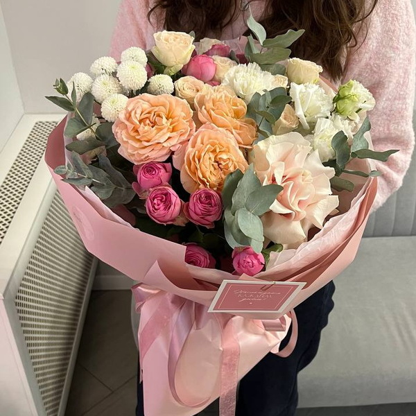 Состав: гвоздика, эвкалипт, кустовая пионовидная роза,роза французская, хризантема кустовая, эустома, авторская упаковка.