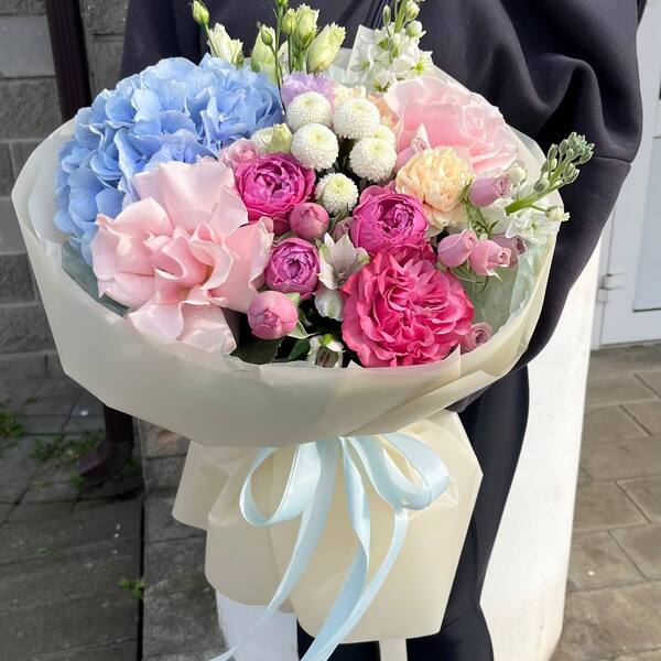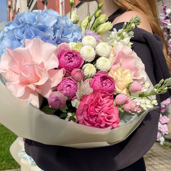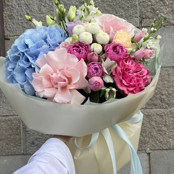 Состав: альстромерия, гортензия, французская роза, кустовая пионовидная роза, матиолла, эустома, хризантема, авторская упаковка.
