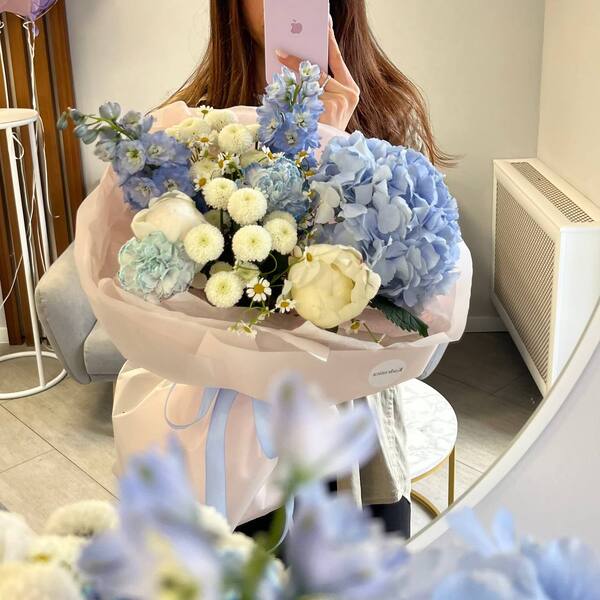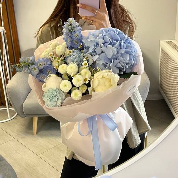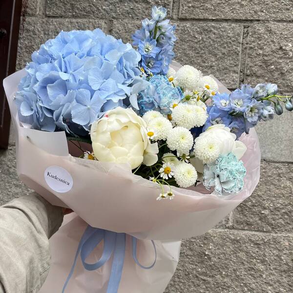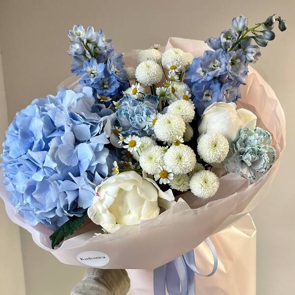 Состав: пион, дельфиниум, танацетум, хризантема кустовая, гвоздика крашеная, гортензия, авторская упаковка.