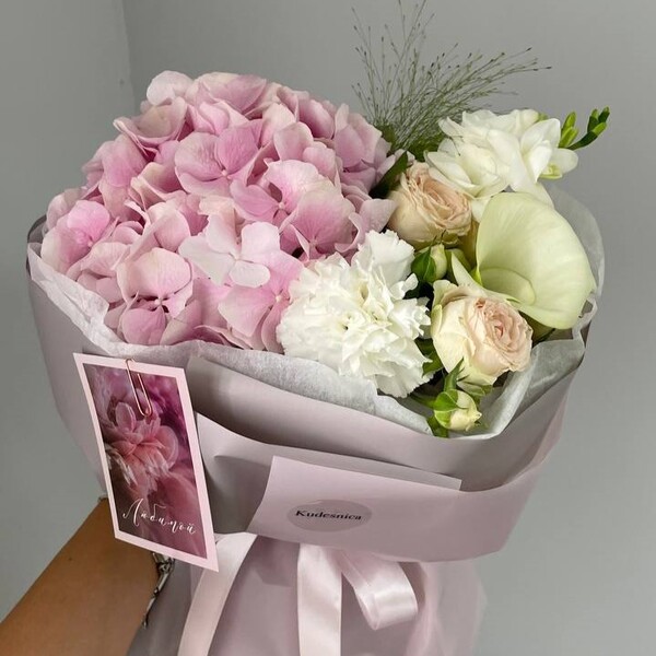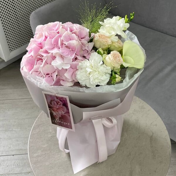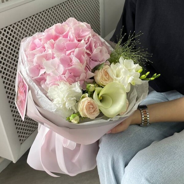Состав: гортензия, калла, фрезия, кустовая пионовидная роза, гвоздика, паникум, авторская упаковка.
