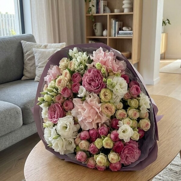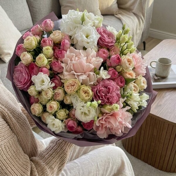 Состав: французская роза, роза кустовая пионовидная, эустома, фрезия, авторская упаковка.