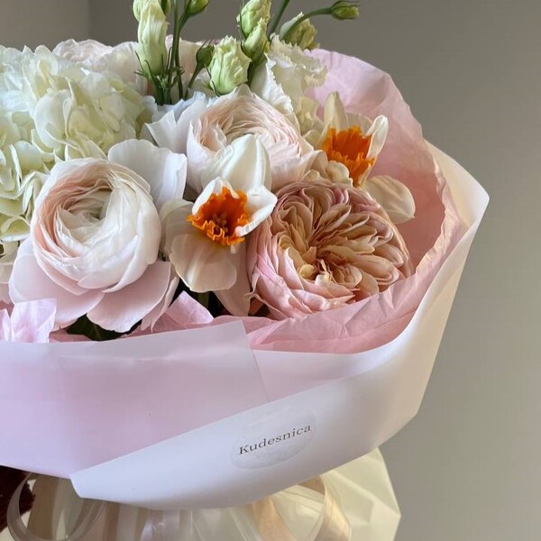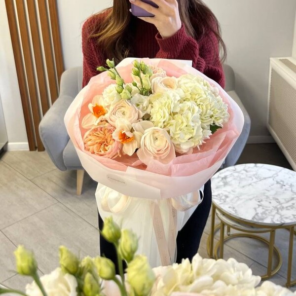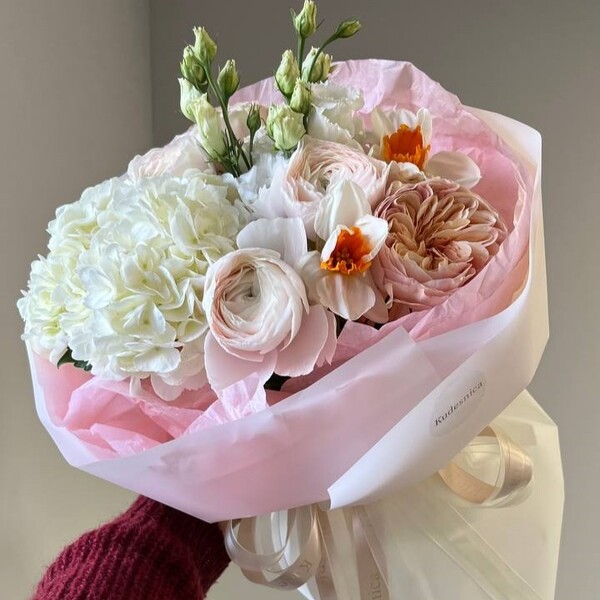 Состав: гортензия, ранункулюс, нарцисс, эустома, пионовидная роза, авторская упаковка.
