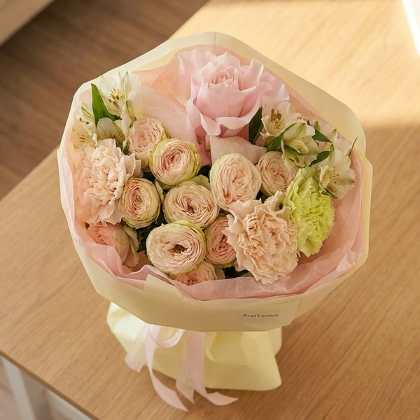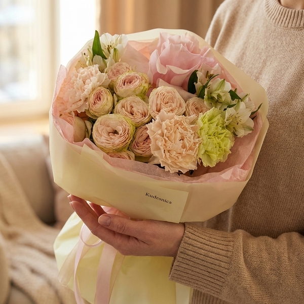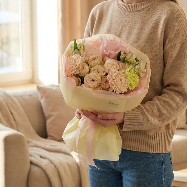 Состав: роза кустовая пионовидная, гвоздика, альстромерия авторская упаковка.