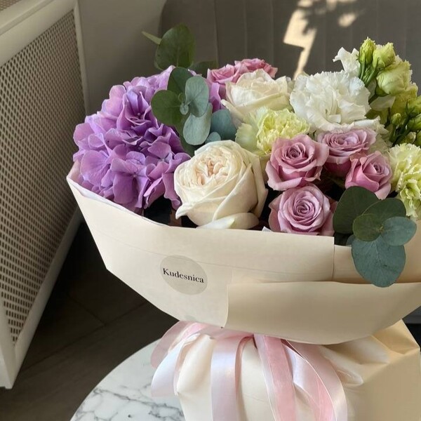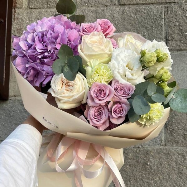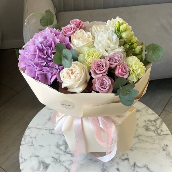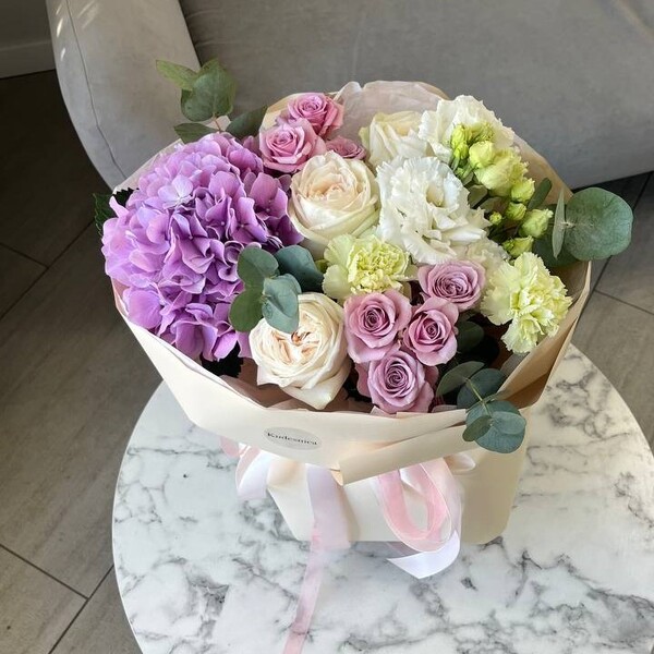 Состав: гортензия, роза одноголовая пионовидная, роза кустовая, эустома, гвоздика, эвкалипт, авторская упаковка.