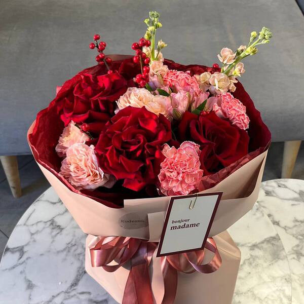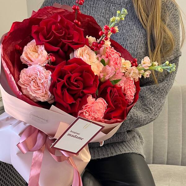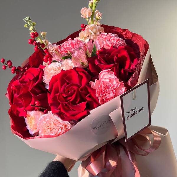 Состав: кустовая пионовидная роза, французская роза, гвоздика, илекс, маттиола, альстомерия, авторская упаковка.