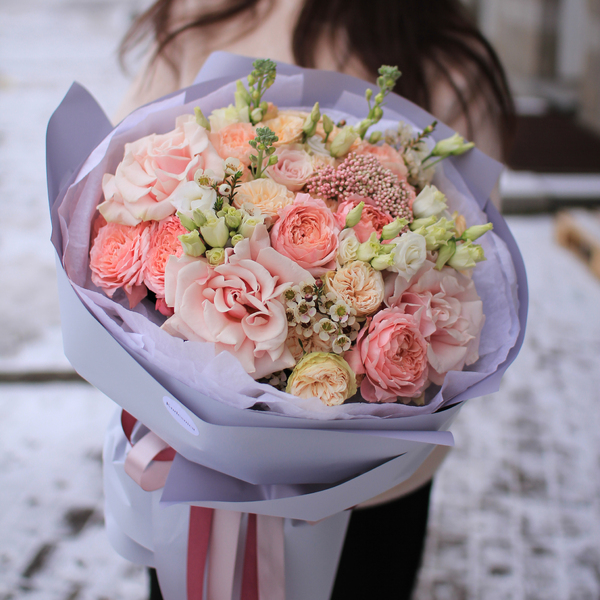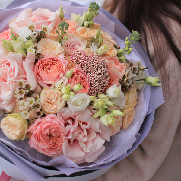 Состав: кустовая пионовидная роза, эустома, хамелациум, озотамнус, эвкалипт, авторская упаковка.