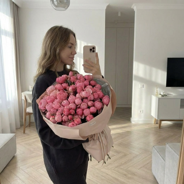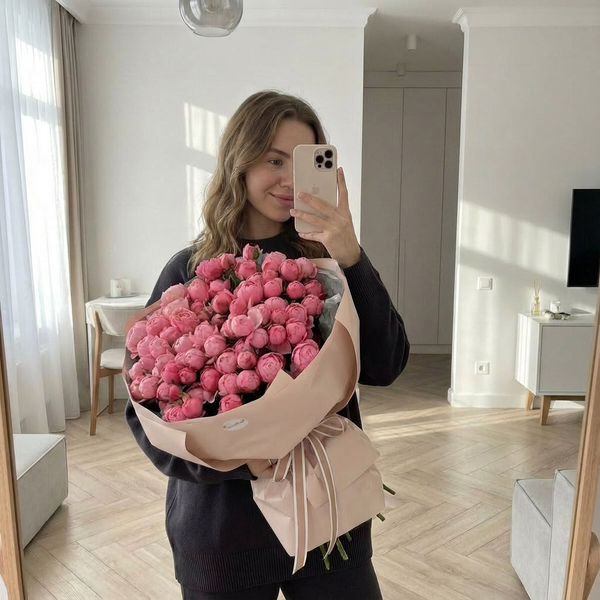 Состав: кустовая пионовидная роза Сильва Пинк 15 веток, авторская упаковка. Открытка в подарок.