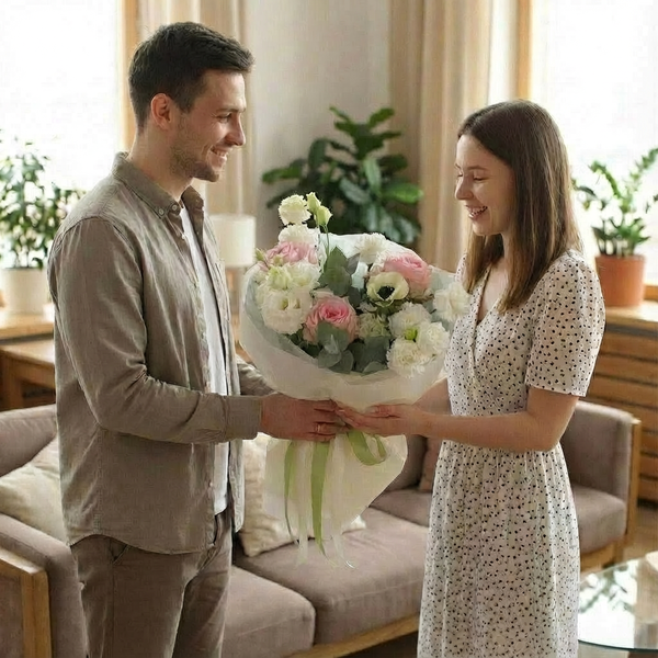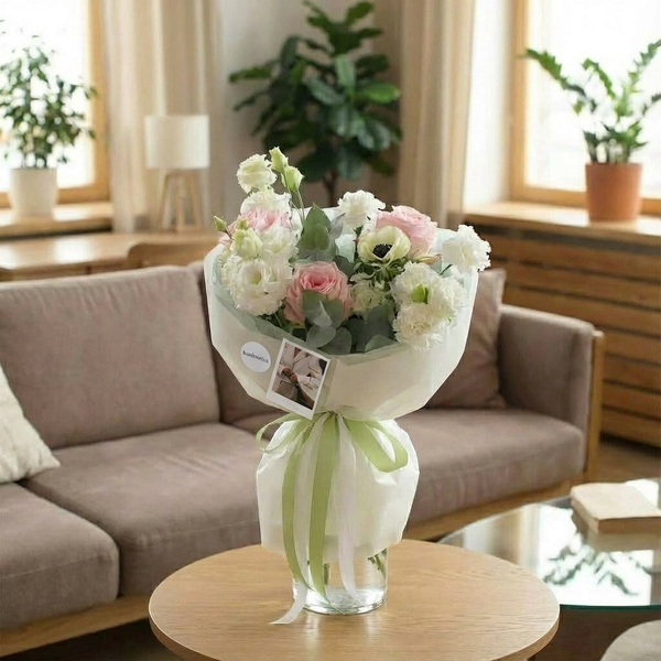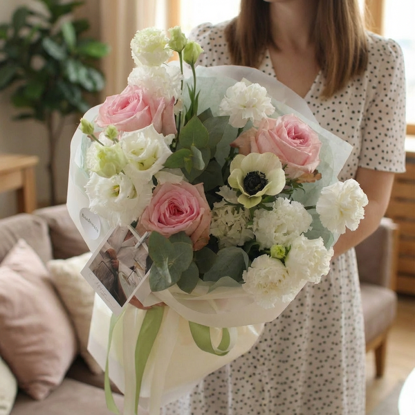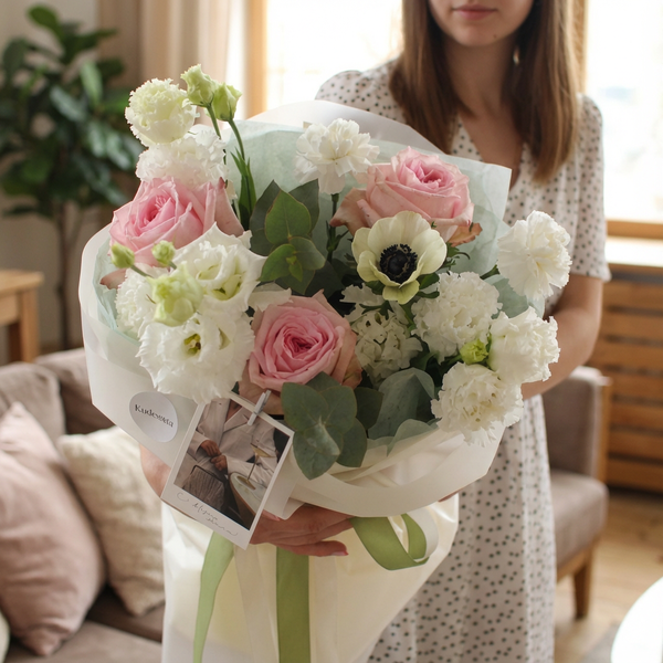 Соcтав: эустома, анемон, роза пионовидная одноголовая, эвкалипт, авторская упаковка. Открытка в подарок.