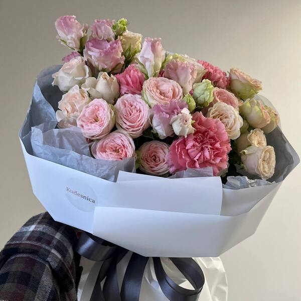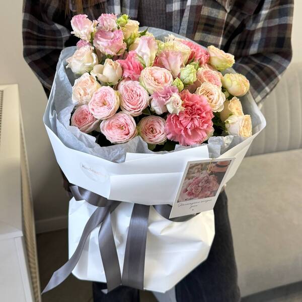Состав: эустома, кустовая пионовидная роза, гвоздика