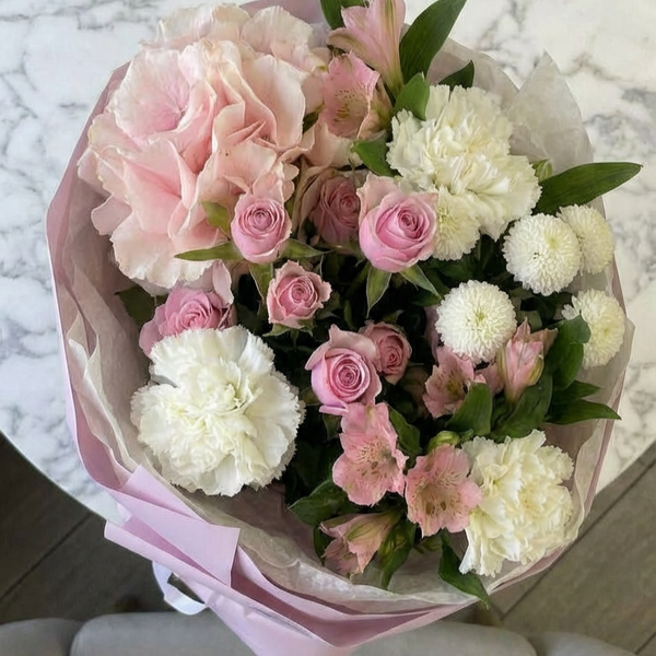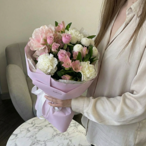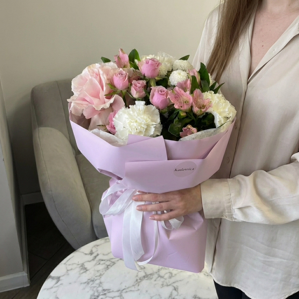 Состав: роза французская, роза кустовая, гвоздика, хризантема кустовая, альстромерия, авторская упаковка.