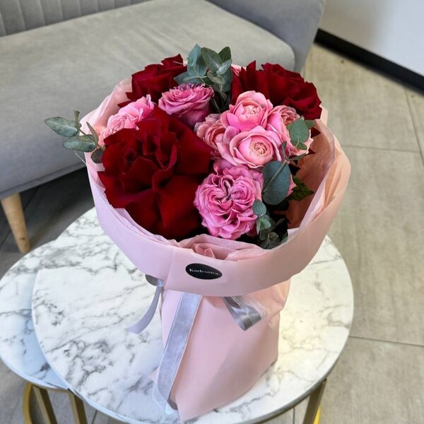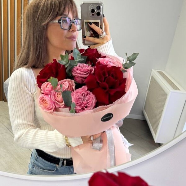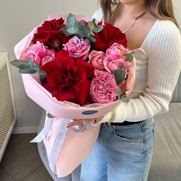 Состав: французская роза, роза одноголовая, роза кустовая пионовидная, эвкалипт, авторская упаковка.
