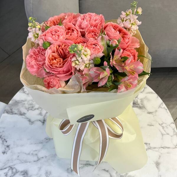 Состав: кустовая пионовидная роза, гвоздика, матиолла, одноголовая пионовидная роза, альстромерия, авторская упаковка.
