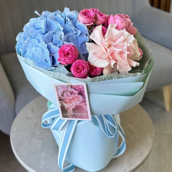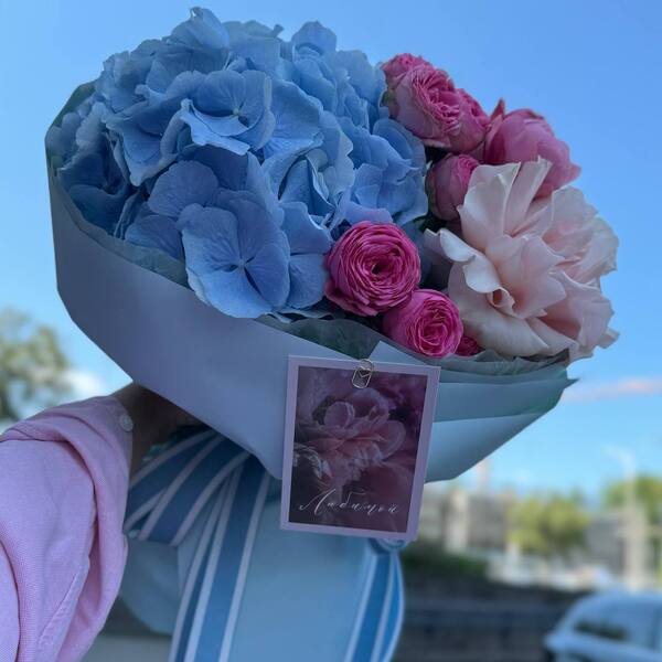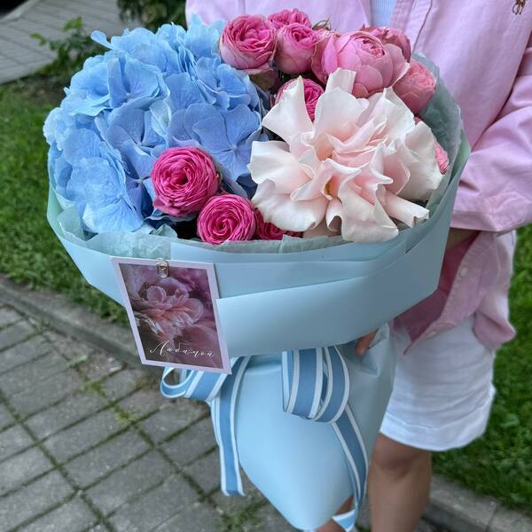 Состав: гортензия, кустовая пионовидная роза, французская роза, авторская упаковка.
