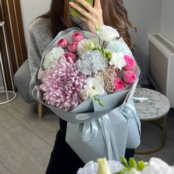 Состав: хризантема, роза кустовая пионовидная, гвоздика, фрезия, озотамнус, авторская упаковка.