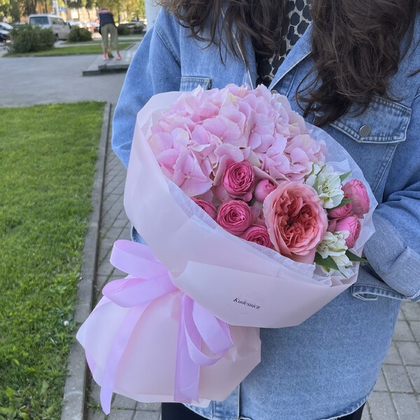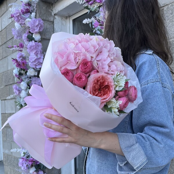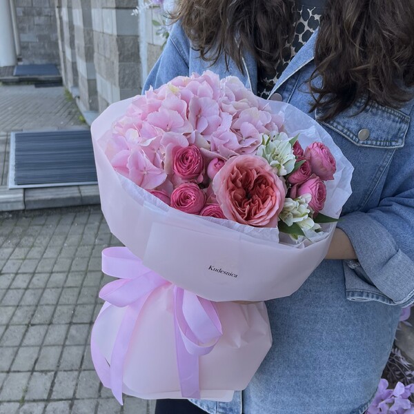 Состав: гортензия, пионовидная одноголовая роза, кустовая пионовидная роза, альстромерия, авторская упаковка.