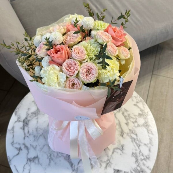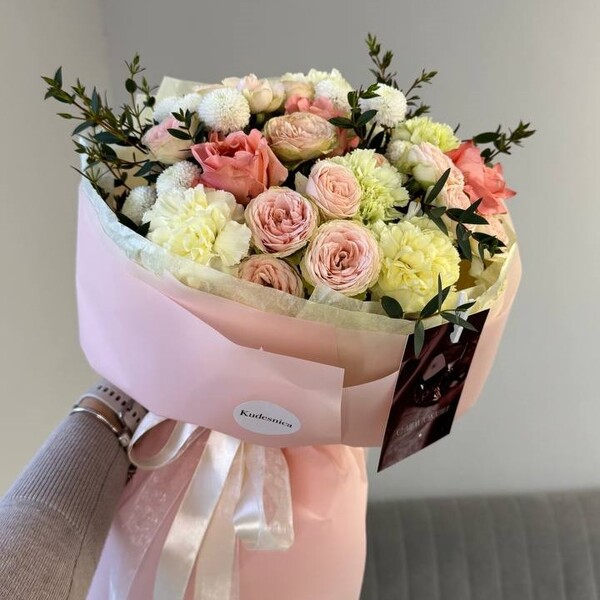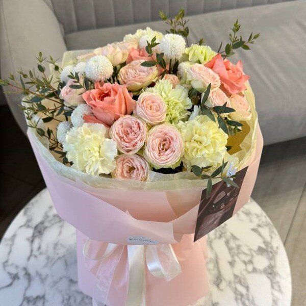 Состав: роза одноголовая, роза кустовая пионовидная, гвоздика, хризантема кустовая, эвкалипт, авторская упаковка.