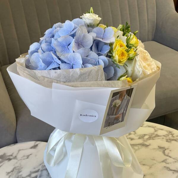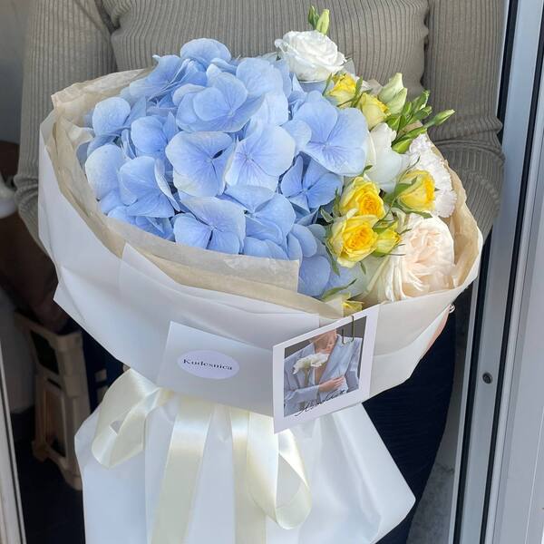 Состав: гортензия, кустовая роза, гвоздика, фрезия, эустома, роза, авторская упаковка.