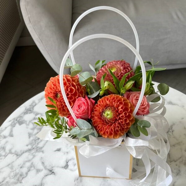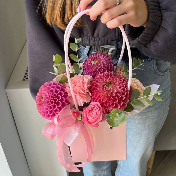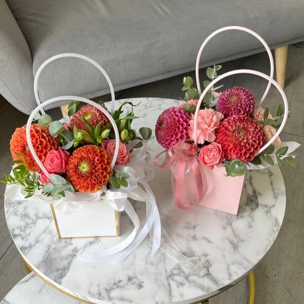 Состав: георгина, гвоздика, роза, альстромерия, кустовая пионовидная роза, технический материал. Стоимость укзана за одну композицию. Вы можете выбрать понравившийся вариант.