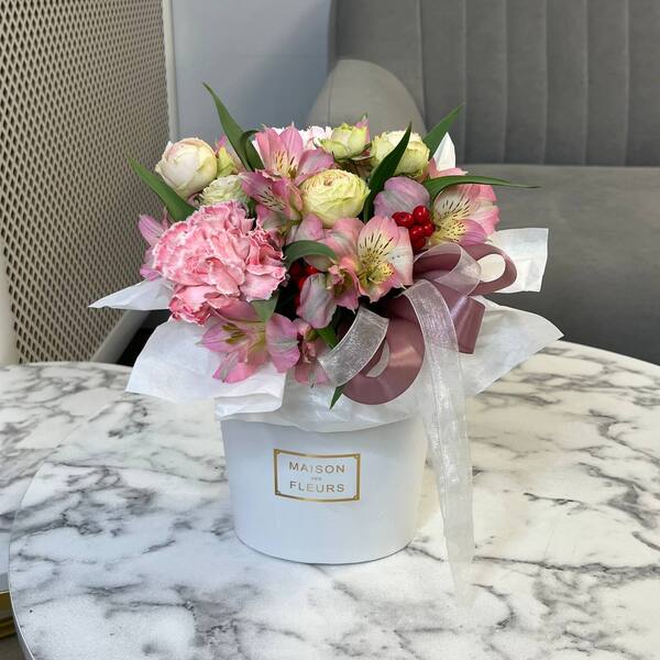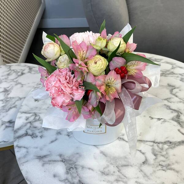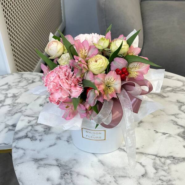 Состав: альстромерия, гвоздика, кустовая пионовидная роза, иллекс, авторская упаковка.