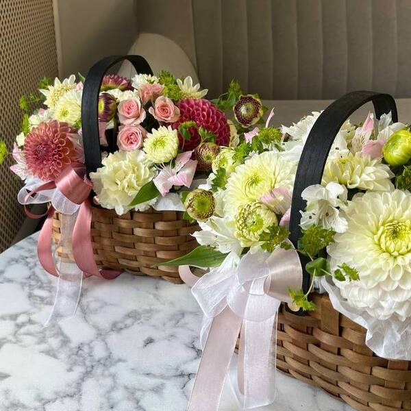 Состав: георгин, роза кустовая, альстромерия, буплерум, корзинка, технический материал, ленты.