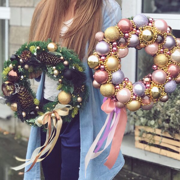 На фото представлены два новогодних венка абсолютно разного характера: один - нежнейший розовый из шаров, второй - контрастный зеленый из хвои. Оба венка выполнены из искусственных материалов. Такой венок имеет неограниченный срок службы. Подходит как для уличного, так и для внутреннего оформления.